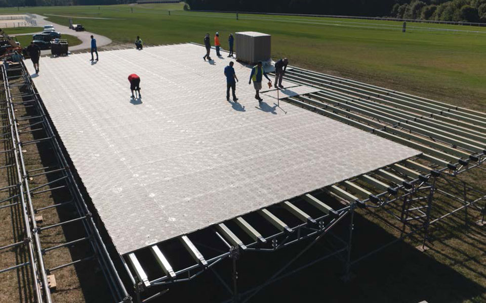 HDPE modular panels that sit on top of BEAMM for elevated installations. Supports 450+ lbs/ft² when elevated with appropriate beam spacing. The complete system for premium event flooring.