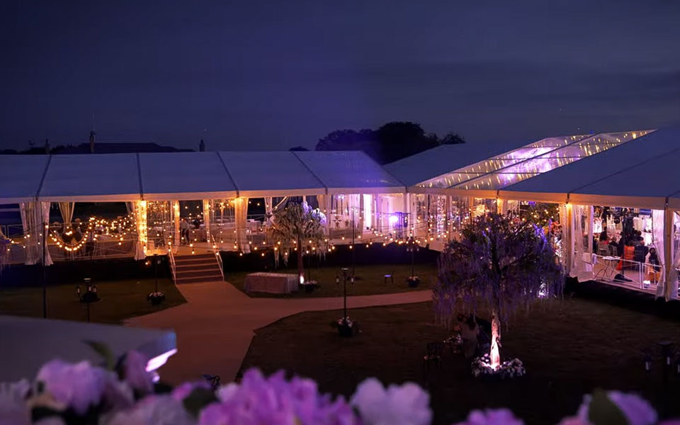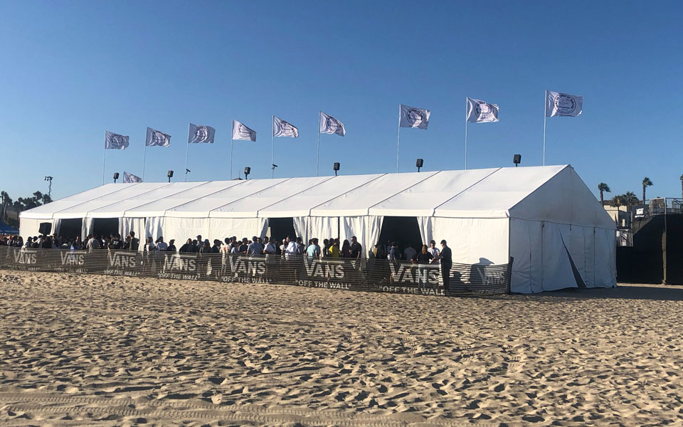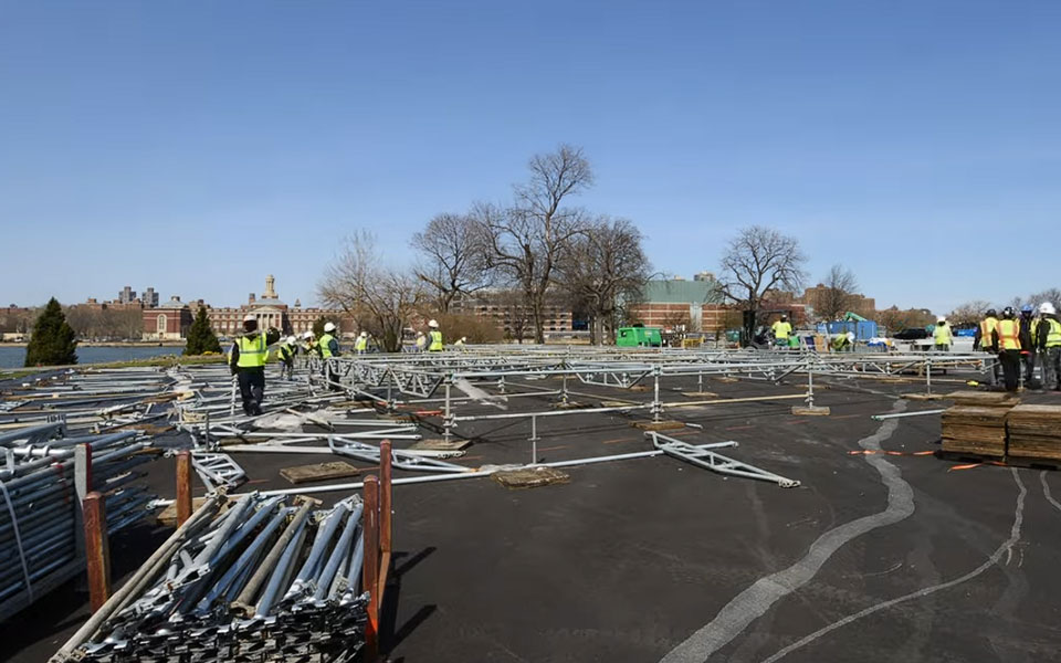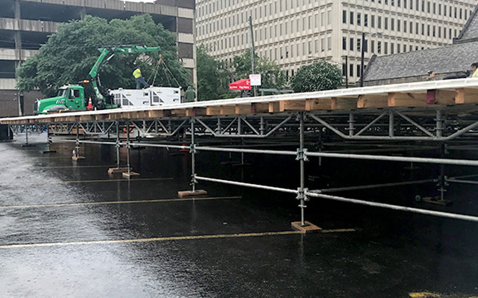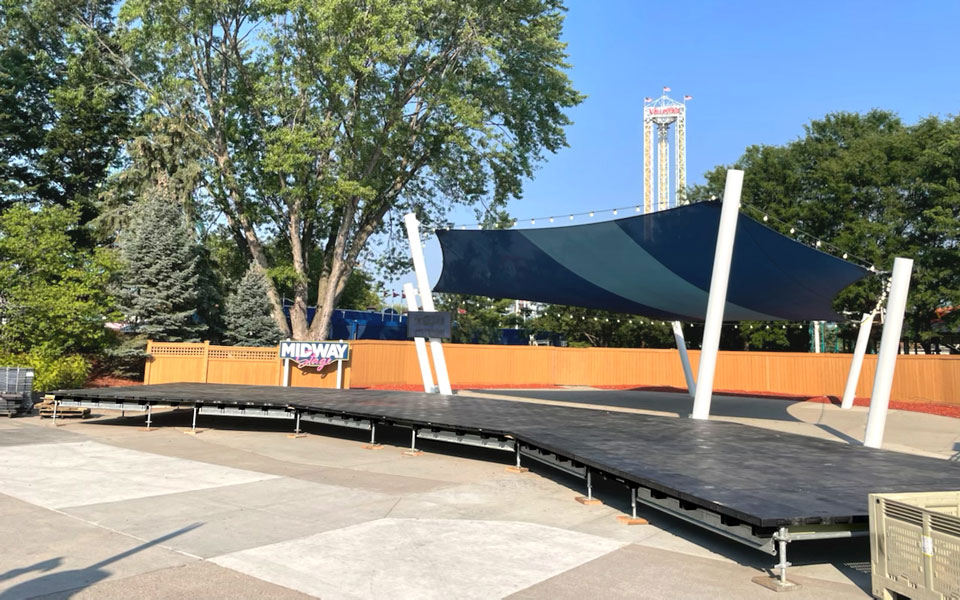 Integrates with scaffolding systems for elevated viewing areas, stages, and hospitality structures.